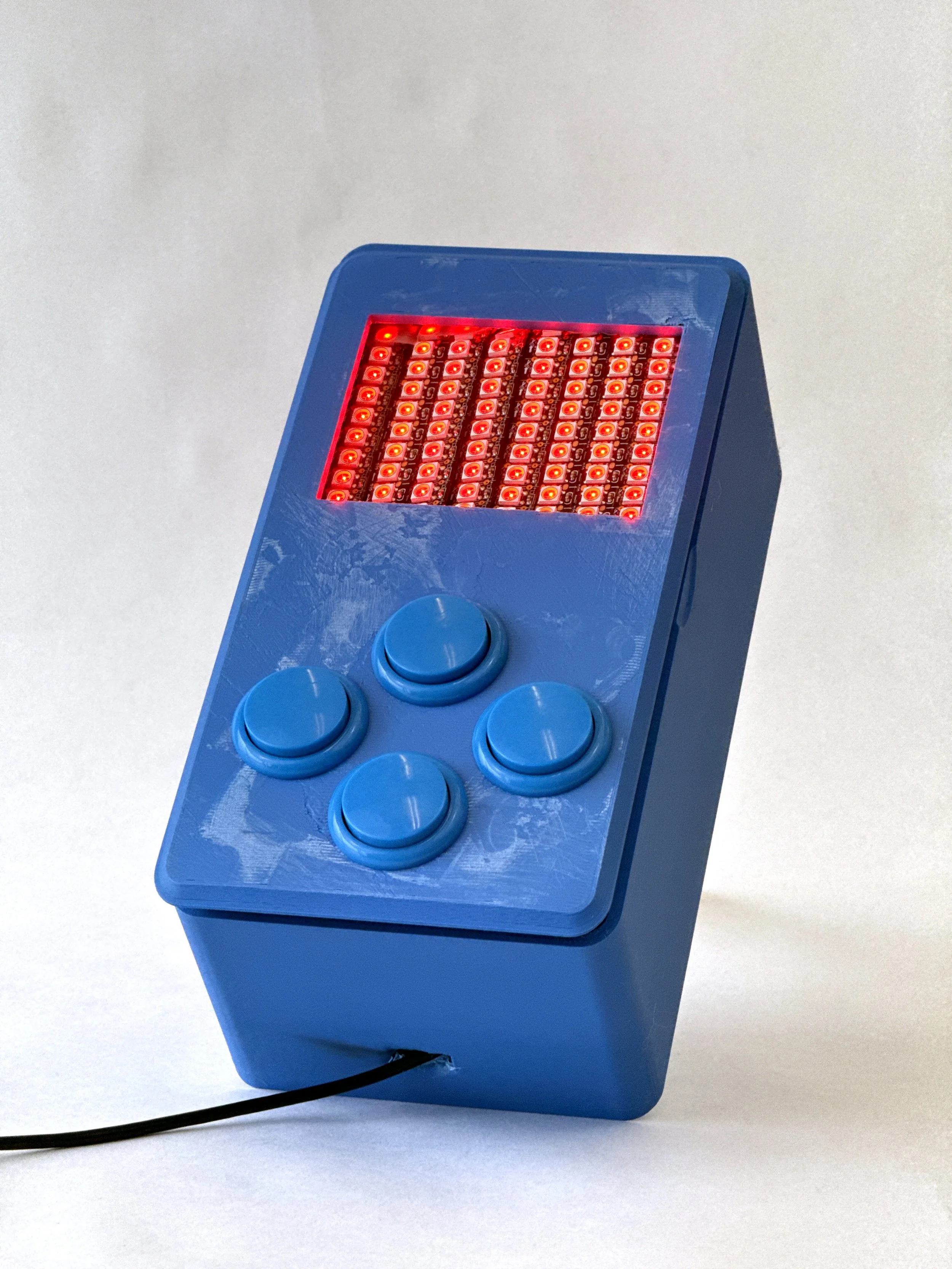 On the software side, I programmed the game using an Arduino Feather, debugging alignment and mapping challenges to ensure the LEDs moved cleanly in straight horizontal and vertical paths. This required recalculating LED indexing and restructuring the logic to accommodate the physical layout of the matrix. This project combines hardware fabrication, enclosure design, and embedded programming into a fully interactive game system.